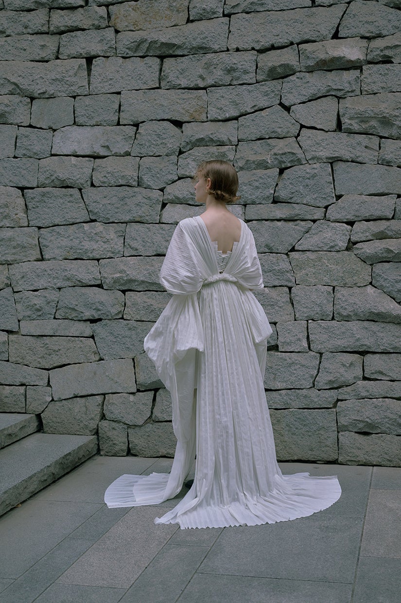 デザインの特徴でもあるプリーツは「山があるから谷があるように地球にあるものの存在意味」や「お互いがお互いを必要とすること」を表現しています。素材、デザインとも地球環境への思いが込められたウェディングドレスのご提案となります。