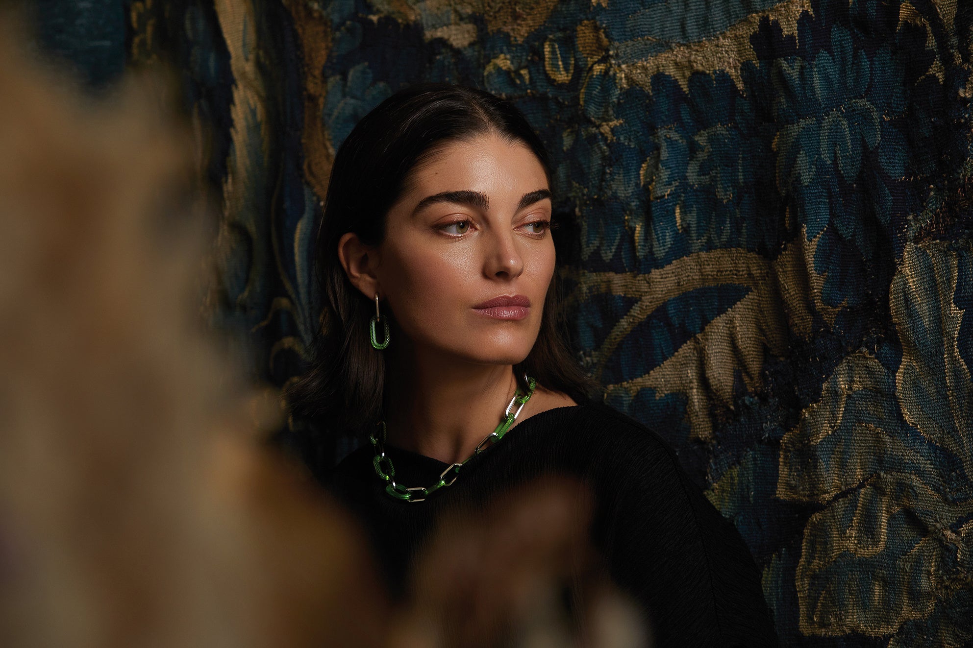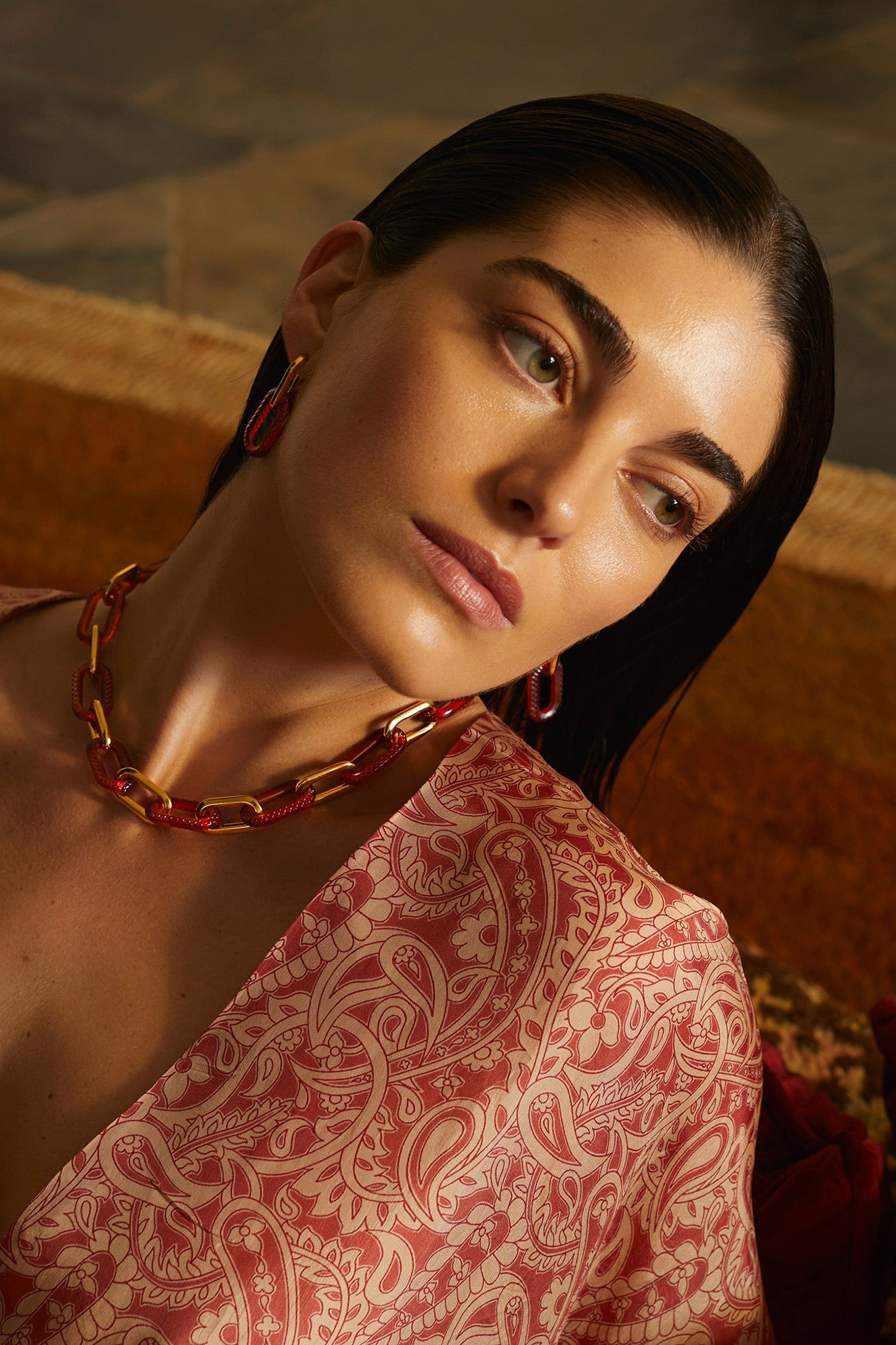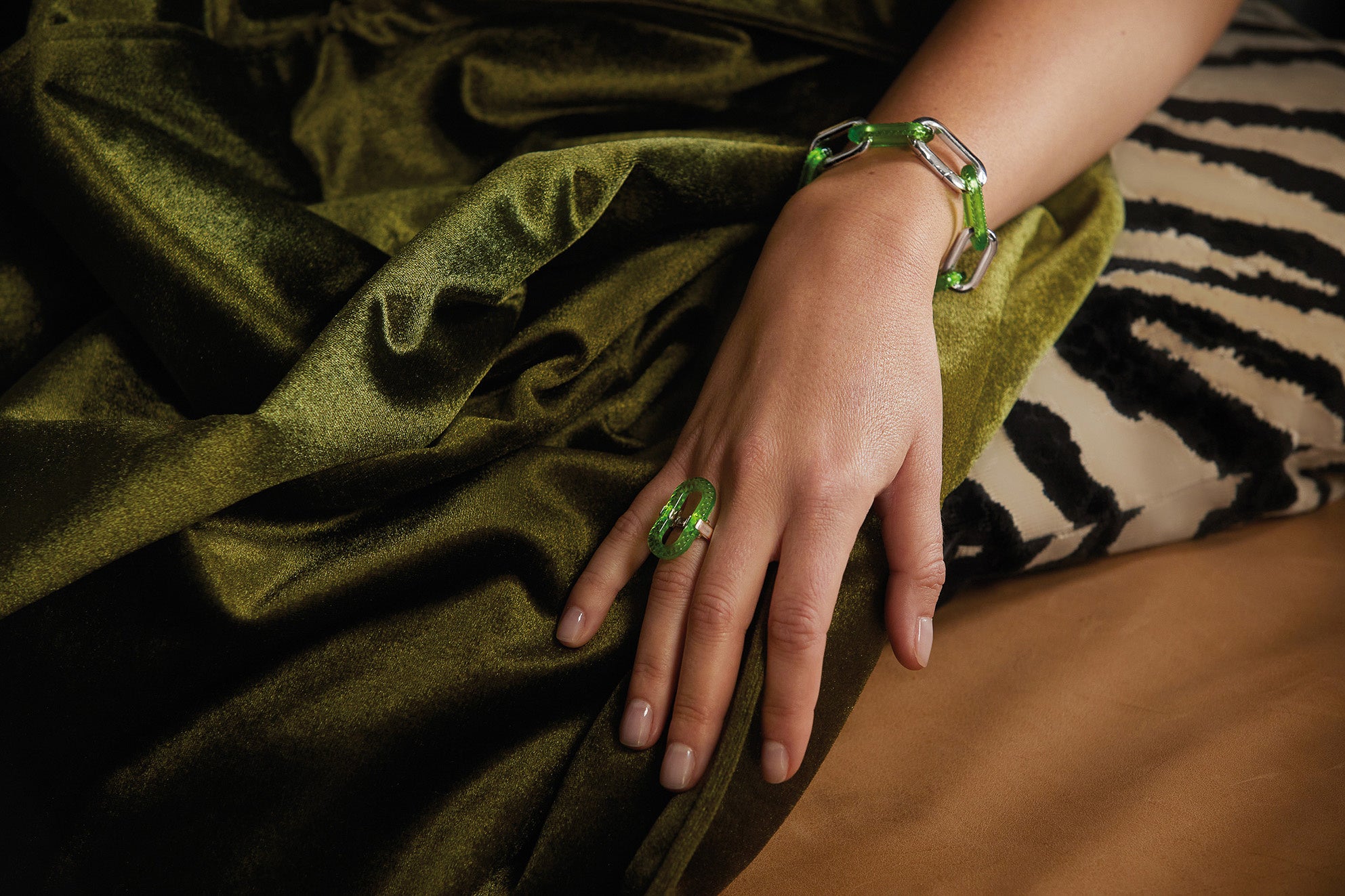 モジュールを採用しフレキシブルなスタイルが楽しめる《アンプラント アニマル》ジュエリーコレクション。Chapter 1で描かれたゼブラストライプは繊細なパイソンパターンへ代わり、そのカラーはブラックとクリアに対をなす鮮烈なレッドとグリーンに染まります。メゾン特有の精巧な仕上げであるサテンと光沢の質感が、このモチーフのリアリティをより一層引き立てます。
