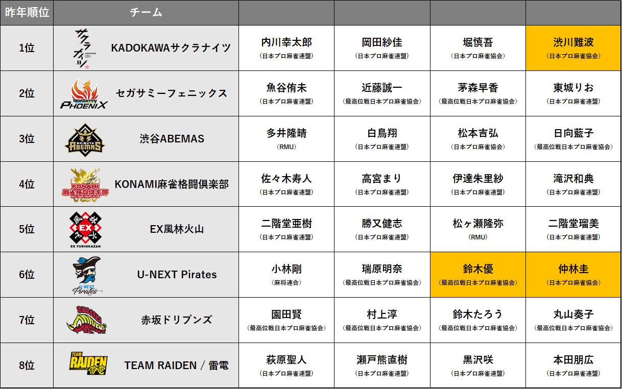 ■「Mリーグ2022-23シーズン」各チーム契約選手一覧