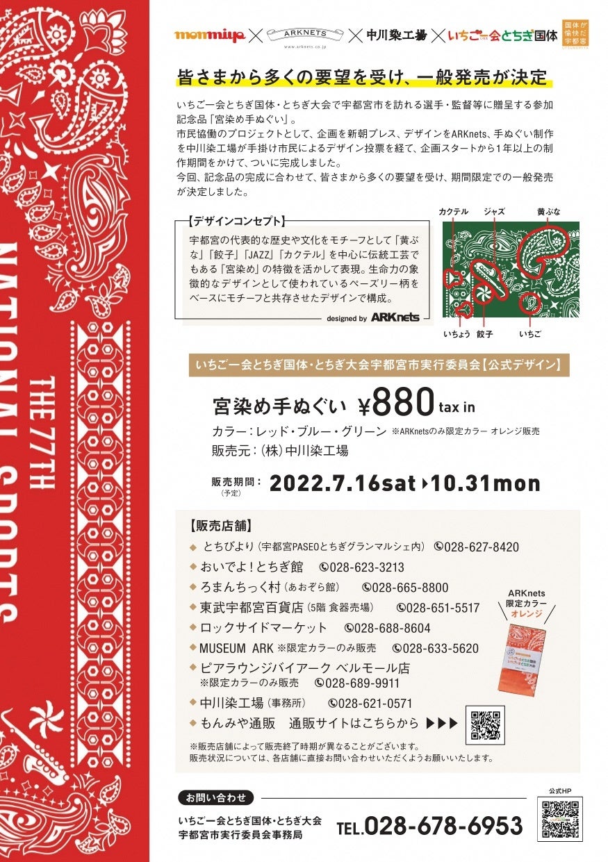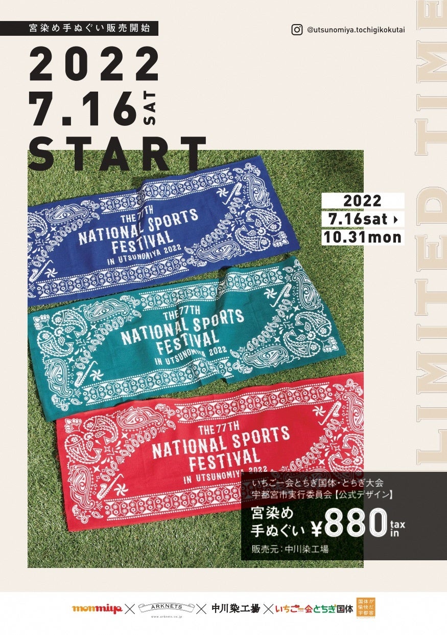 令和4年10月に開催される「いちご一会とちぎ国体・とちぎ大会」で栃木県宇都宮市を訪れる選手・監督等に贈呈する参加記念品である、「国体オリジナルデザイン宮染め手ぬぐい」の一般販売が開始されました。宇都宮市の伝統工芸である宮染めを扱う事業者(㈱中川染工場)と高感度のファッションを取り扱うアパレル事業者(㈲リストリクト=ARKnets)の力が融合し、うつのみやの魅力が詰まった製品となっています。デザインの中にある、「餃子」「カクテル」「ジャズ」などの観光資源を探してみてください。