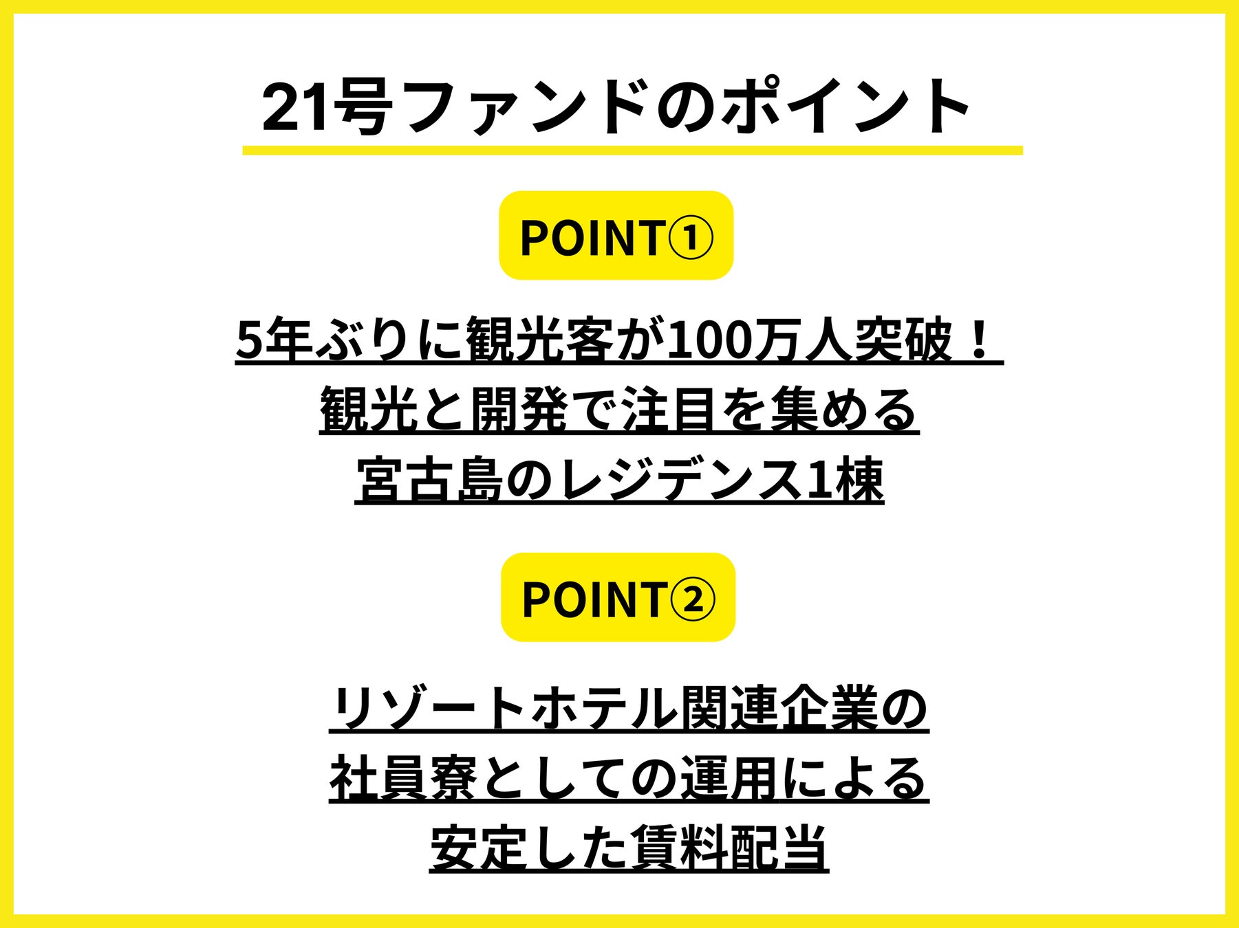 株式会社LEVECHY(所在地:東京都港区赤坂、代表取締役:高 将司、以下「当社」)は、当社が運営する1万円から始める賢い資産運用「LEVECHY(レベチー)」にて、沖縄県宮古島市に位置するレジデンス1棟を投資対象とする「LEVECHYファンド21号」について、募集を開始いたしましたことをお知らせいたします。