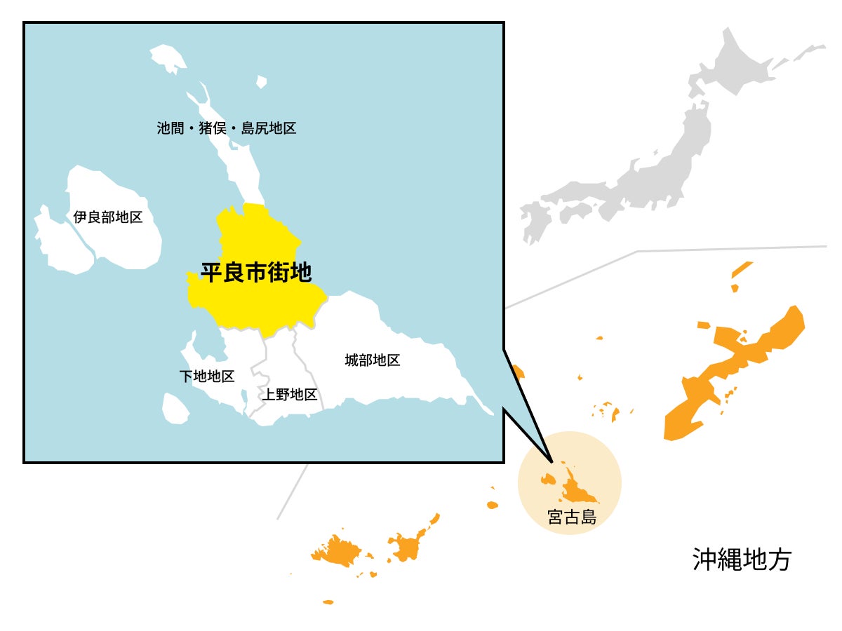 本物件が所在する宮古島市の平良市街地エリアは、宮古島市の人口の約7割が集中する市の中心地です。