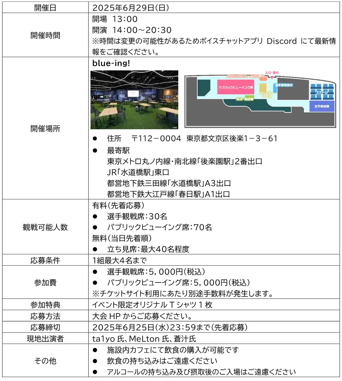 本イベントは『Overwatch 2(オーバーウォッチ2)』を対象にしたeスポーツイベントで、1チーム5~7名、128チームのエントリーを募集します。また、本戦は東京ドームシティ内の施設「blue-ing!」でオフライン開催とし、選手を近くで観戦いただける選手観戦席と、実況解説のゲストとご一緒に楽しめるパブリックビューイング席の2つのパターンの有料席をご用意しております。なお、当選されなかった方も見学可能な後方立見席をご用意する予定です。