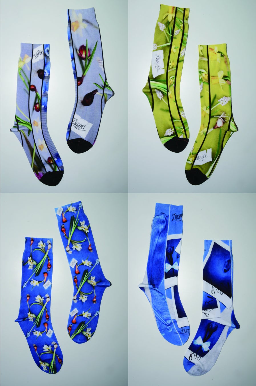 そこから生まれる文化的価値と新しいコミュニケーションを日々のくらしの中に提供する表参道の人気フラワーショップ「DILIGENCE PARLOUR(ディリジェンスパーラー)」とコラボレーションした限定ソックスを4月21日(金)から発売いたします。印刷の可能性をテーマに、花束や球根を使って大胆に遊んだ全8種のデザインをご用意しました。Tabioの都内限定店舗などでご購入いただけます。4月25日(火)よりTabio表参道ヒルズ店ではDILIGENCE PARLOURによるコラボディスプレイを展示しますので、ぜひ足をお運びください。
