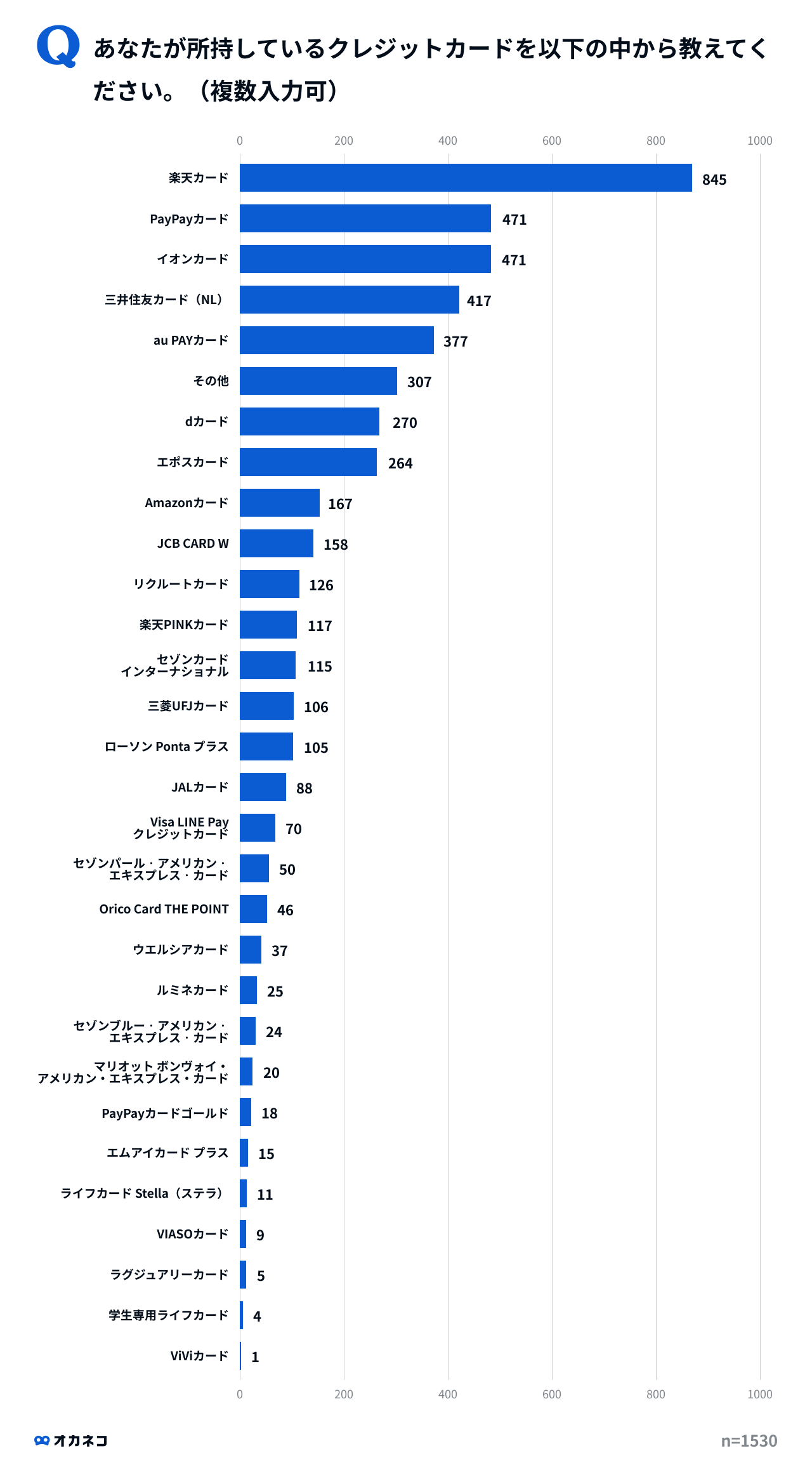 「あなたが所持しているクレジットカードを以下の中から教えてください。」という質問に対して、「楽天カード」がもっとも多く、1,530人の回答者のうち、実に845人(55.23%)の方が所持している結果となりました。