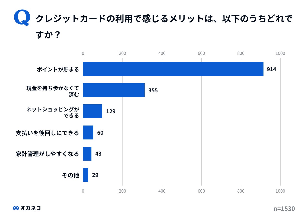 クレジットカードの利用で感じるもっとも大きなメリットとして、約6割(59.74%)の人が「ポイントが貯まる」ことを挙げています。ポイント還元率が高く、年会費が安いカードが人気であることとも紐づく結果となりました。
