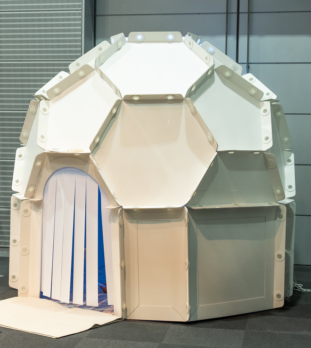 親子向けセンサリールームの開発経験を持つパナソニックは、照明技術など電気設備に関する知見を強みとしています。当事業では、知的、発達、精神障がいなど、いわゆる「見えづらい障がい」に関する啓発やイーラーニングを手がけるリーンオンミーと連携し、ノイズをおさえ、視覚、聴覚、触覚を適度に刺激できるドーム型の簡易型センサリールームを共同開発し、効果検証を行いました。