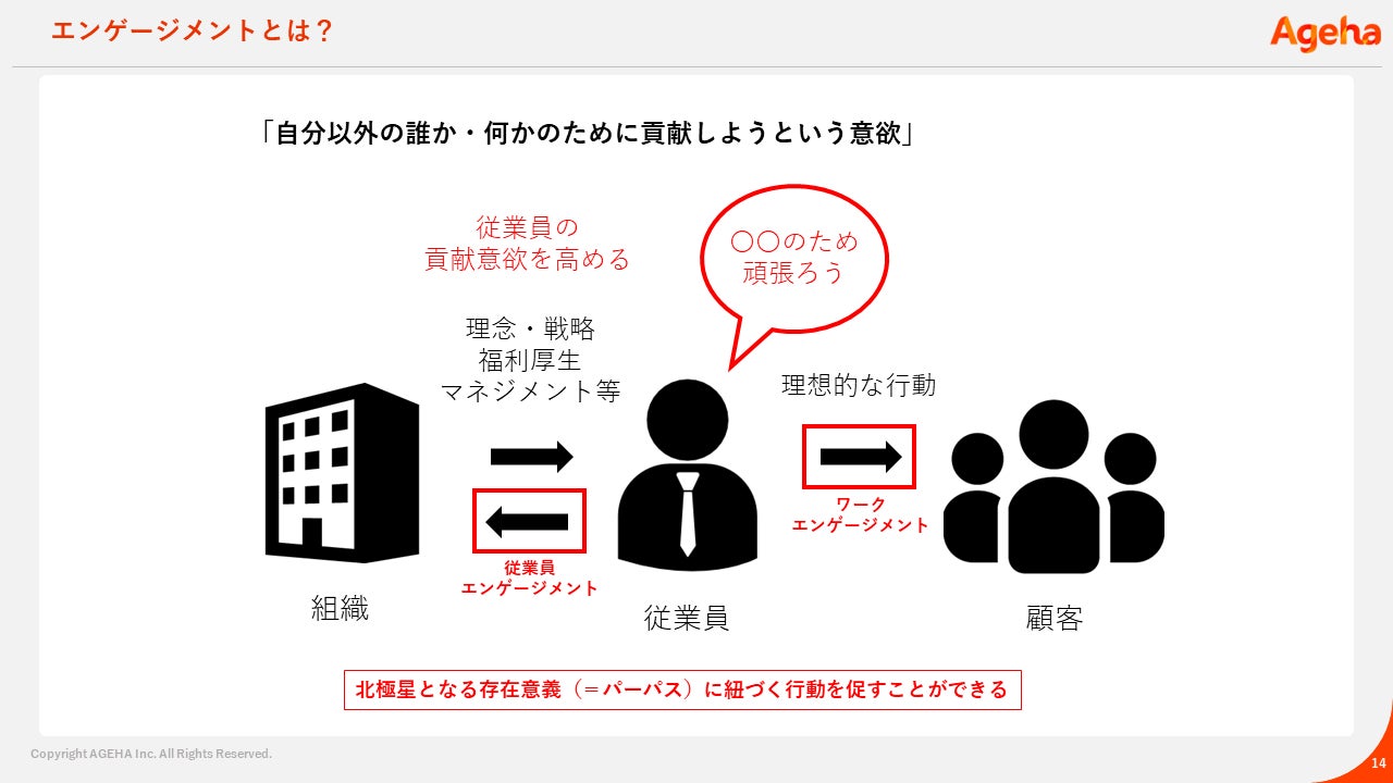 従業員満足度が高まっても顧客への価値が向上するとは限らず、モチベーションが高まっても会社の方向とずれる可能性があります。一方、エンゲージメントは「自分以外の誰か・何かに貢献しようという意欲」であり、北極星となる存在意義(パーパス)に紐づく行動につながります。