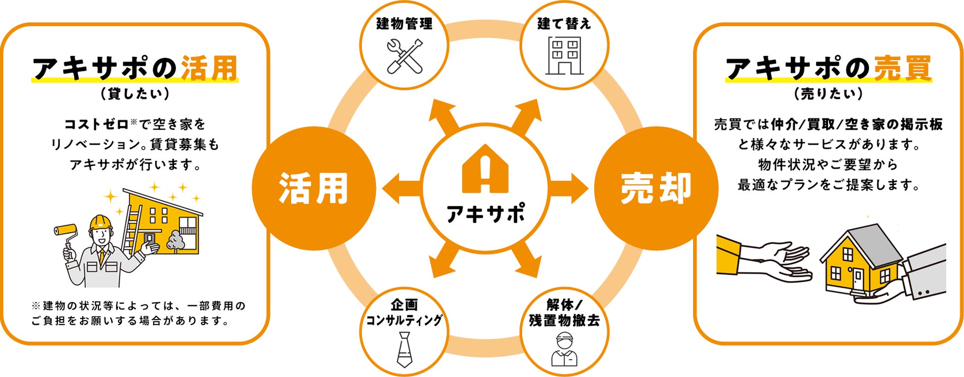 空き家のお悩みに対して「アキサポ」が寄り添い、活用や売却などのさまざまな選択肢の中から最適なプランをご提案、所有者様の手間なく、お悩みを解決いたします。創業時より大切にしている物件の多様化(不動産それぞれの土地や周辺のニーズに合わせた活用方法)を最大限に活かした事業を目指し、2016年にスタートしました。