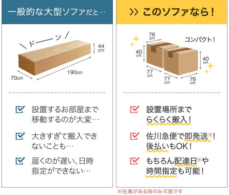 コンパクトな梱包なので、一般的な大型ソファで使用する超大型商品の配送を用いず、宅配便でお届けができます。