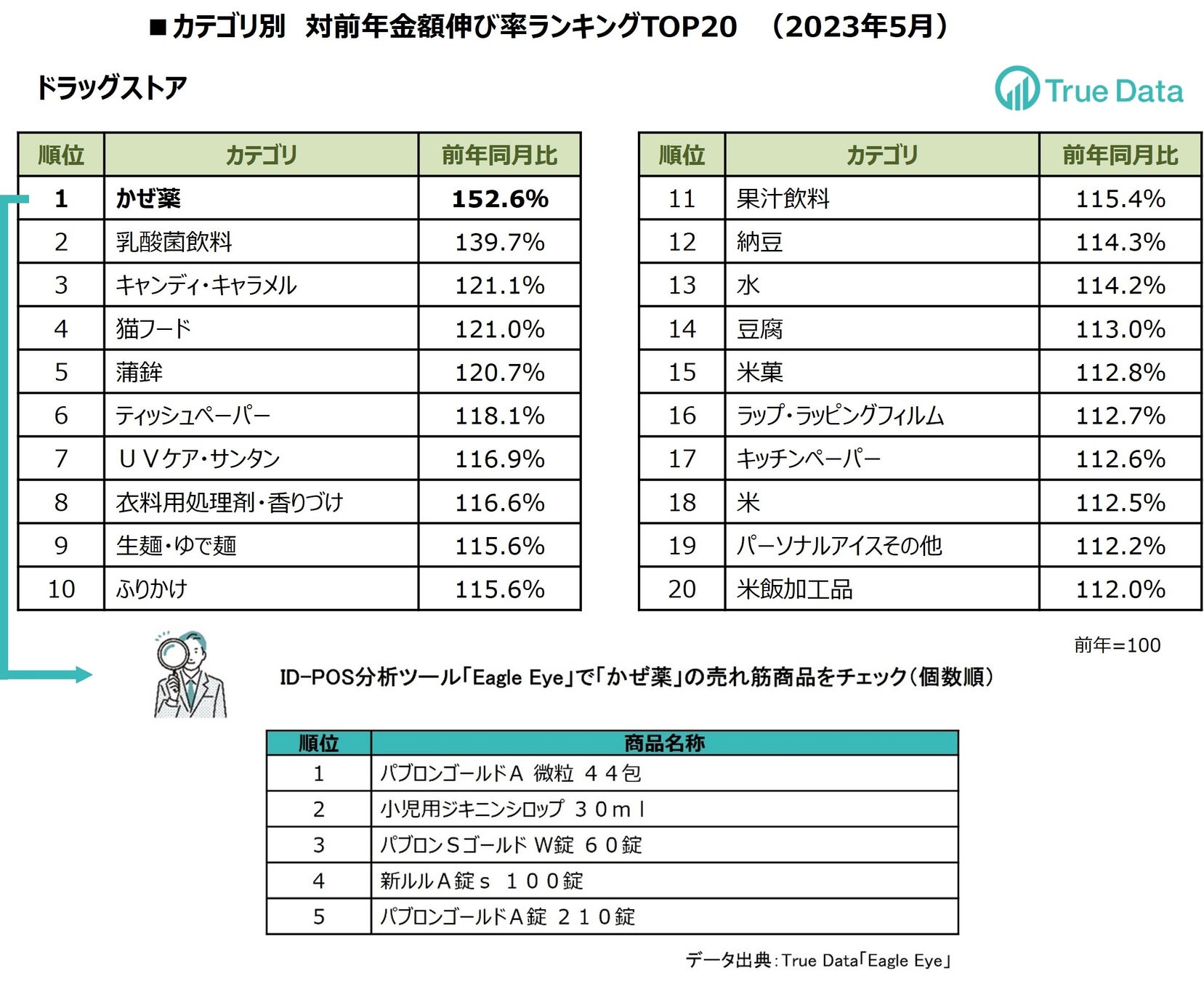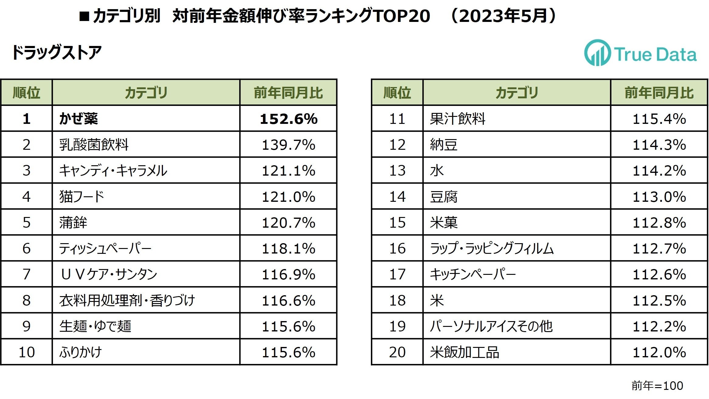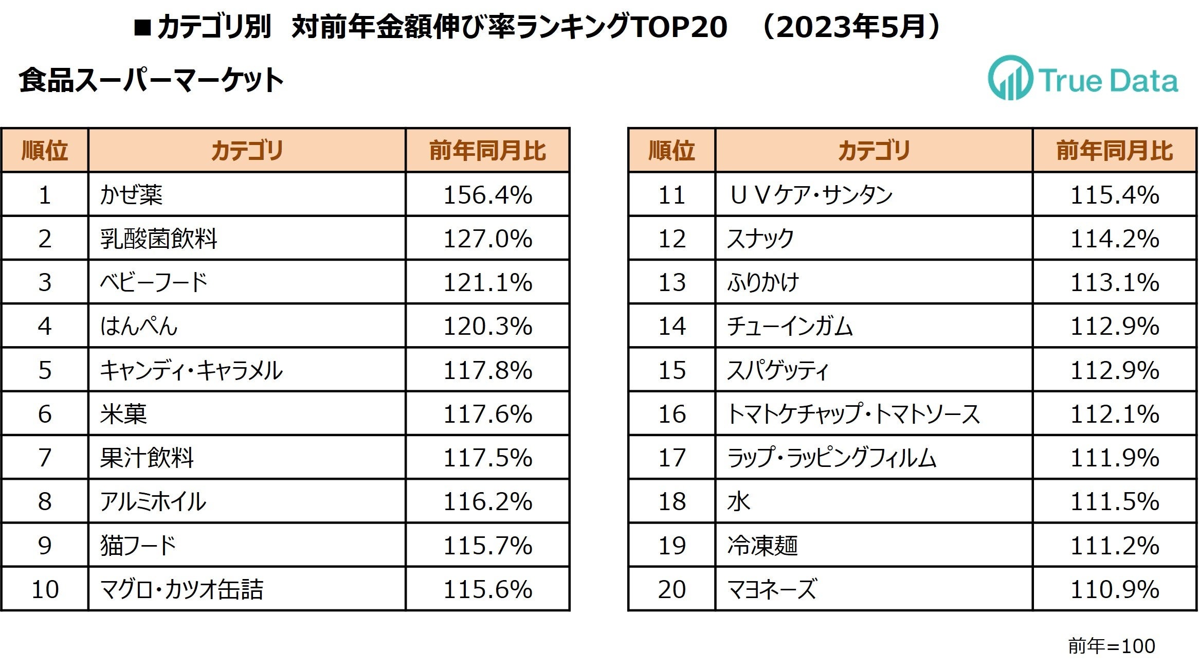 ~ドラッグストア、食品スーパーマーケット 2023年5月の対前年伸び率TOP20カテゴリを発表 ~