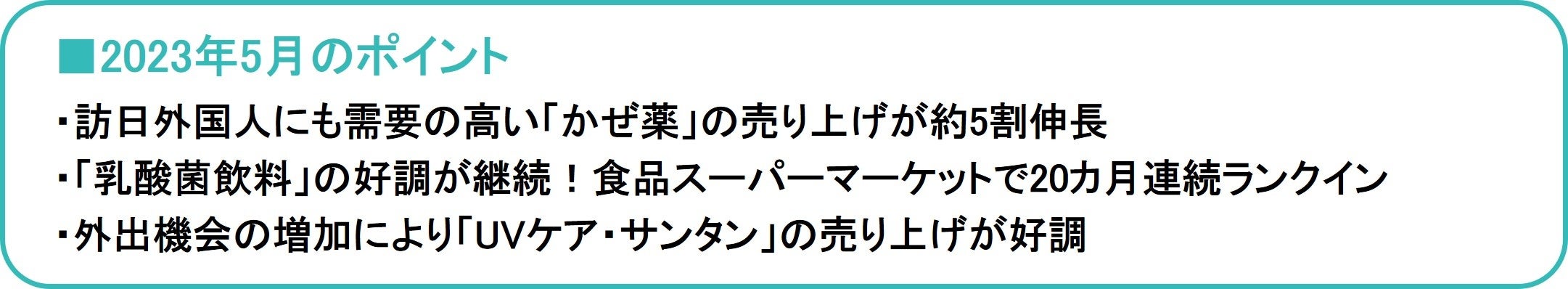 訪日外国人にも売れている「かぜ薬」の売り上げが前年同月に比べ大きく伸長し、ドラッグストア、食品スーパーマーケットの両業態において伸び率ランキングの1位を記録しました。当社のID-POS分析ツール※で確認したところ、ドラッグストアで5月に最も売れた「かぜ薬」は「パブロンゴールドA 微粒 44包」でした。両業態とも2位にランクインした「乳酸菌飲料」は、ドラッグストアで39.7%増加、食品スーパーマーケットで27.0%増加しました。食品スーパーマーケットで「乳酸菌飲料」は2021年10月以降20カ月連続でTOP20にランクインしており好調が継続しています。外出の機会が増えたためか、「UVケア・サンタン」の売り上げも好調でした。ドラッグストアでは前年同月比16.9%増加、食品スーパーマーケットでは同15.4%増加しました。4年ぶりに行動制限のないゴールデンウイークだったため、外出の機会が増え、日焼け対策の商品を購入する人が増えたと考えられます。