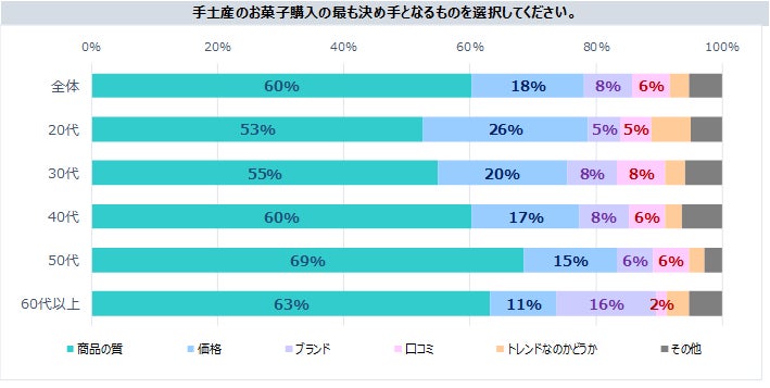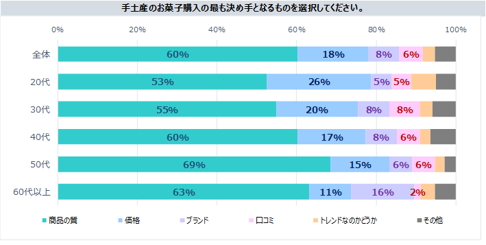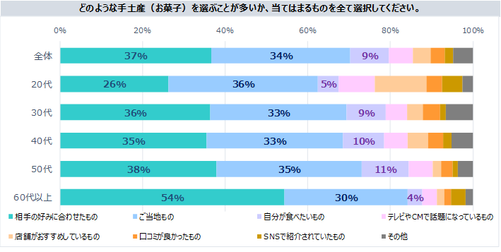 調査ではこれ以外に、手土産にかける金額や手土産に求めることなど全36問で回答を得て、年代別、性別、職業別、既婚・未婚別に集計しています。