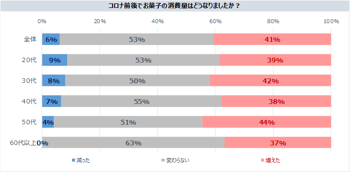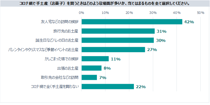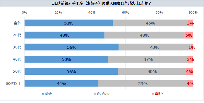 コロナウイルスによる巣ごもりなどの影響でお菓子の消費量が「増えた」人は41%。一方、手土産としてお菓子を購入する頻度は「減った」人が52%で、人と会う機会が減ったことが大きく影響したようです。しかし、その中でも全く買わない人は約20%で残りの約80%の人はコロナ禍でも手土産を購入しています。