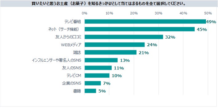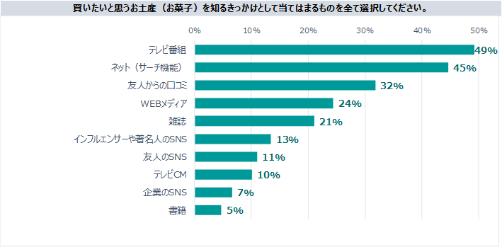 手土産の購入目的は「友人宅などの訪問の挨拶」が最も多く、デパートなどの百貨店で洋菓子を購入する傾向にあるようです。手土産に買いたいと思うお菓子を知るきっかけは「テレビ」が最も多く49%、次いでネットで調べるが45%となりました。購入の決め手は「商品の質」で、重視するところは「相手の好みに合わせたもの」となっています。手土産の必要性を感じている人が62%、コロナウイルスによる行動制限が緩和したら積極的に手土産を購入したいとする人が67%となりました。
