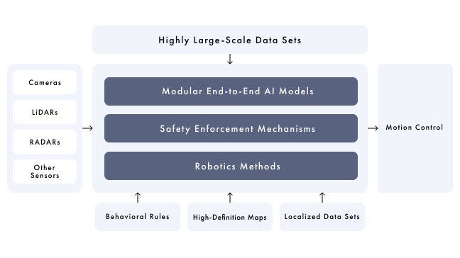従来の自動運転レベル4は、確率論的推定や機械学習を含むロボティクス技術を基盤とし、高精度地図や詳細なルール定義、走行環境データを活用して、センシング、自己位置推定、環境認識、経路計画、制御といった各機能を構成してきました。Autowareはこのアーキテクチャに基づいて開発され、世界中の自動運転システムに導入されています。