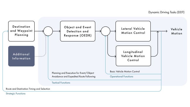 「レベル4+」のシステム機能は、動的運転操作(Dynamic Driving Tasks:DDT)を人間に依存しない点は従来のレベル4と同様です。一方で、戦略上の機能(Strategic Functions)においては、外部の人間からの助言や路側機などからの入力を受け入れることで、対象運行領域(Target Operational Domain : TOD)内に含まれる環境変化に対しても柔軟に対応できる構造となっています。戦術上の機能(Tactical Functions)および操作上の機能(Operational Functions)は引き続きシステムが主体となり、安全性の担保も自律的に実行されます。たとえば、走行中に人間が経路を調整し、ODDとTODが整合するようシステムに戦略的な方向性を与えるといった運用が想定されます。