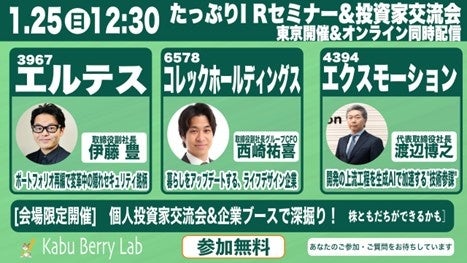 株式会社コレックホールディングス(本社:東京都豊島区、代表取締役:栗林憲介)の取締役副社長グループCFOである西崎祐喜は、2026年1月25日(日)開催の個人投資家向け参加型IRセミナー「Kabu Berry Lab」に登壇します。