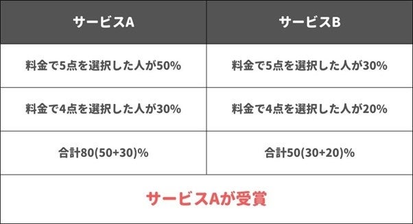 各サービスの項目について5段階で評価してもらい、5点+4点の合計の割合が最も高いサービスを各部門(使い続けたいサービス・プロバイダNo.1以外の部門)のNo1として受賞としております。