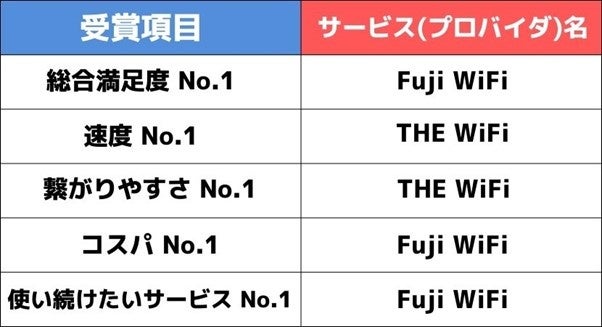 本アワードは、WiMAX・ポケット型WiFiの専門比較サイト「WiMAX比較.com」がモバイルWiFiサービスの顧客満足度の実態調査を目的として、モバイルWiFiの利用経験がある2600人にアンケートを実施。アンケート結果をもとに、各部門で最も顧客満足度が高いモバイルWiFiのサービス(プロバイダ)を表彰しています。