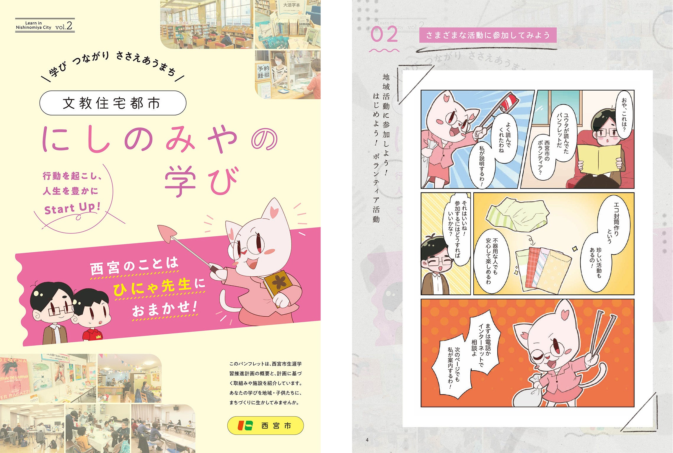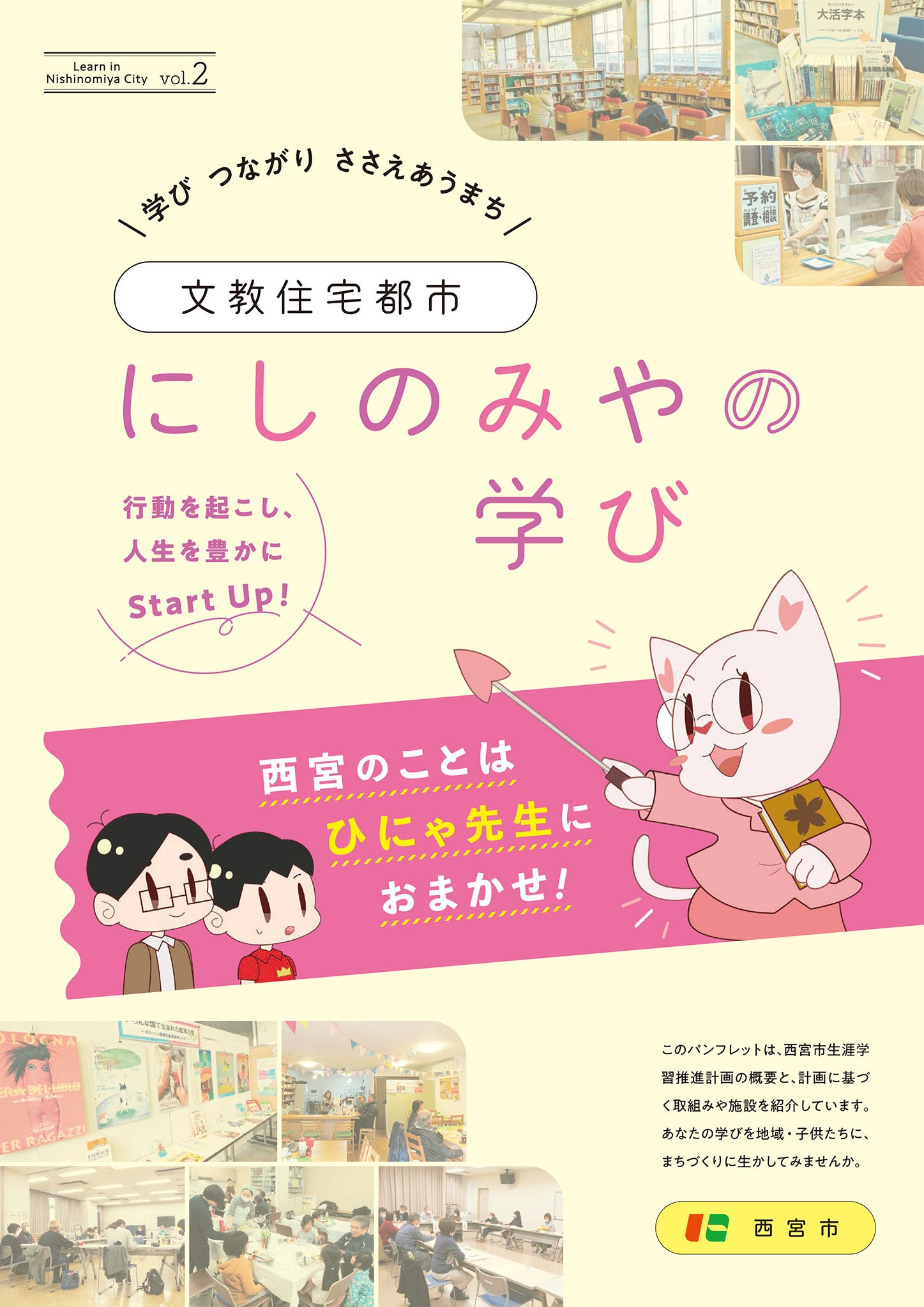 パンフレットではオリジナルキャラクターである妖精の「ひにゃ先生」が、にしのみやの学びについてナビゲートしています。