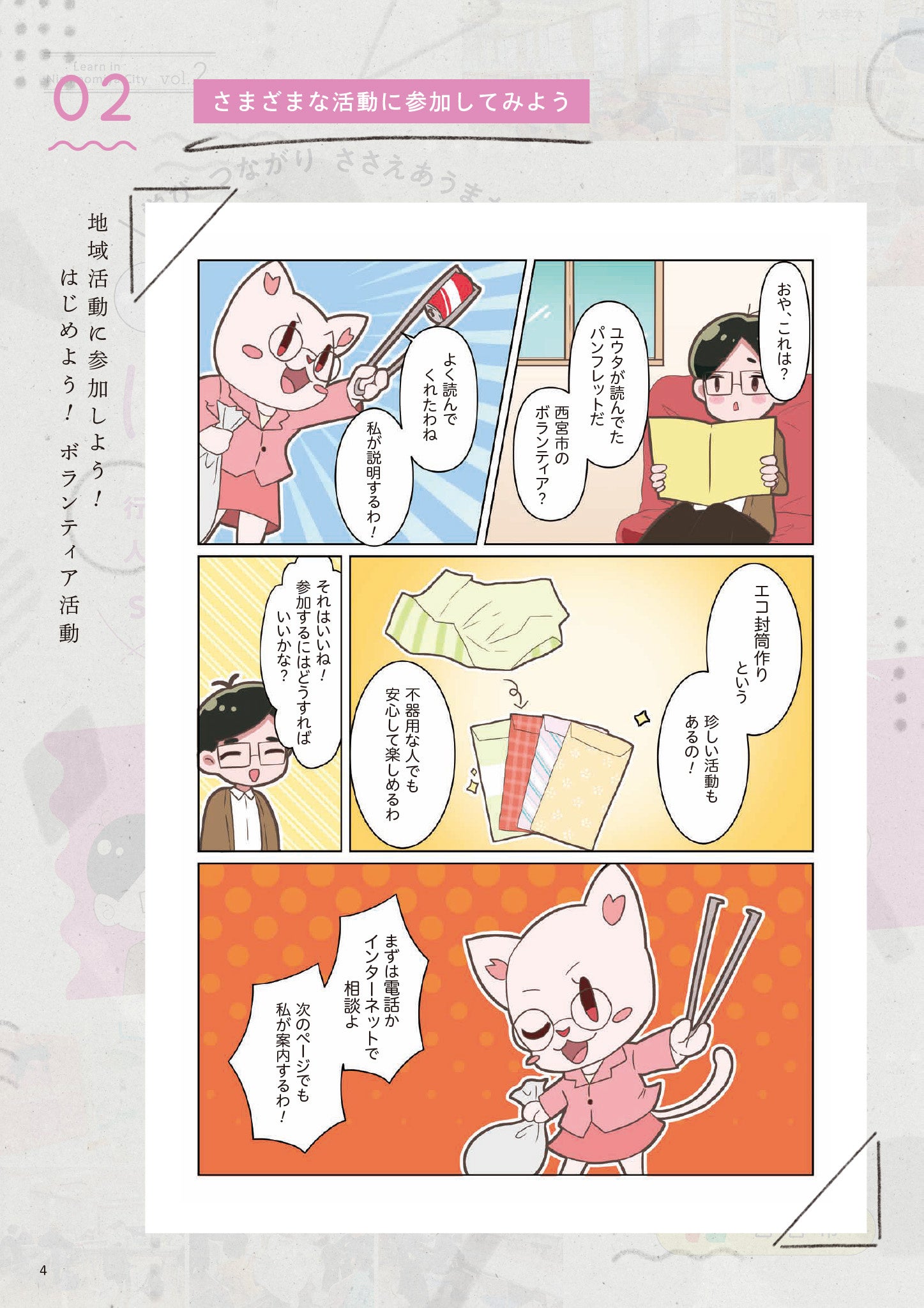 「何かを始めてみたい」「誰かのために何かをしたい」「地域や社会での活動に参加したい」と思った時に、気軽に手に取ってもらえるよう、マンガを取り入れた分かりやすい内容のパンフレットを目指し制作されたパンフレットは、冊子でお読みいただける他、以下よりダウンロードが可能です。