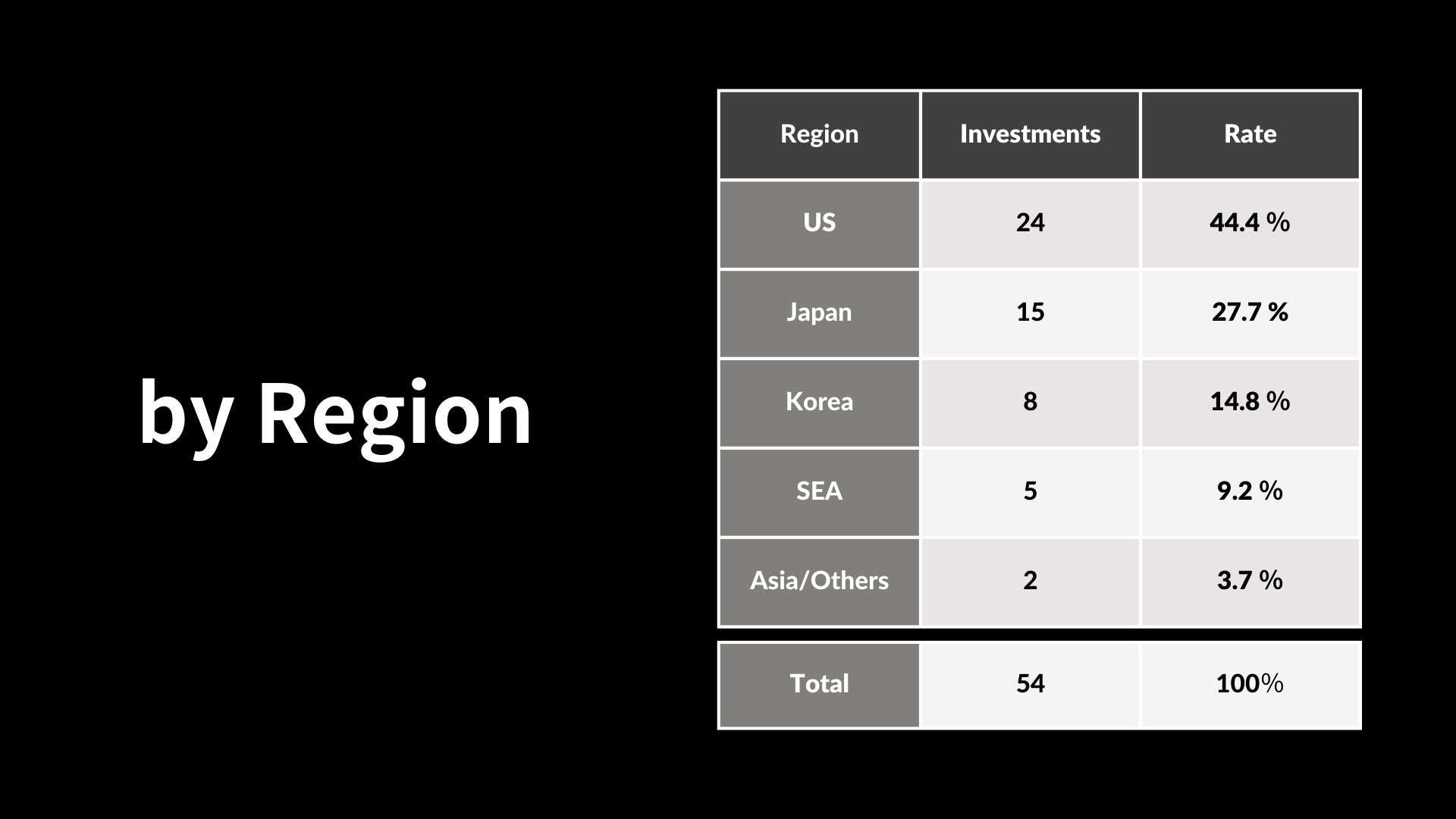 ことしZVCは、東京、ソウル、サンフランシスコの3拠点を中心に、日本、韓国、東南アジア、アメリカなどで、*¹54社に対して、合計で約52億2,400万円の投資を行いました。