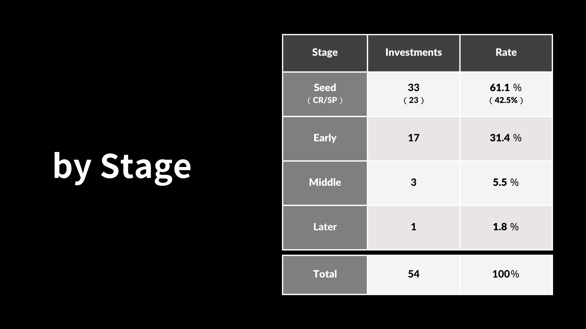 ZVCでは、シードからレイターのオールステージ投資を掲げ、投資活動を行っています。ことしの特徴では、シードステージでの投資が全体の6割を占めました。その内訳として、米国で実施しているAIに注力した投資プログラム「US Seed Program(SP)」や日本での「Code Republic(CR)」の件数がシード投資全体の大半を占め、全体の投資件数増加を後押ししました。