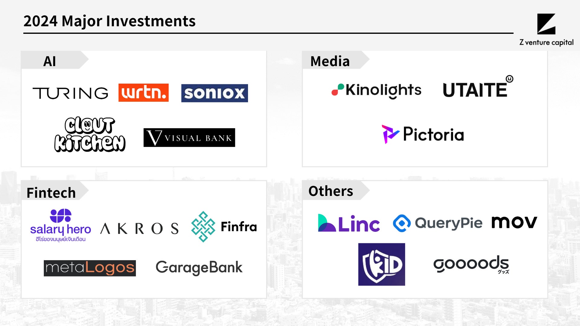 そうした中で、ZVCの日本チームは13社への投資を実行しました。データ・AI、Fintech、人材、エンタメ、B2B・C2Cマーケットプレイスなどのテーマを中心に注力しました。AI技術が急速に進化する現在、これを産業のディスラプションの機会と捉え、我々の投資仮説も日々アップデートを重ねています。ベンチャーキャピタルはこうした変革期にこそ積極的であるべきと考えており、2025年は既存の枠組みを超えた新たな挑戦に力を注いでいきたいと考えています。