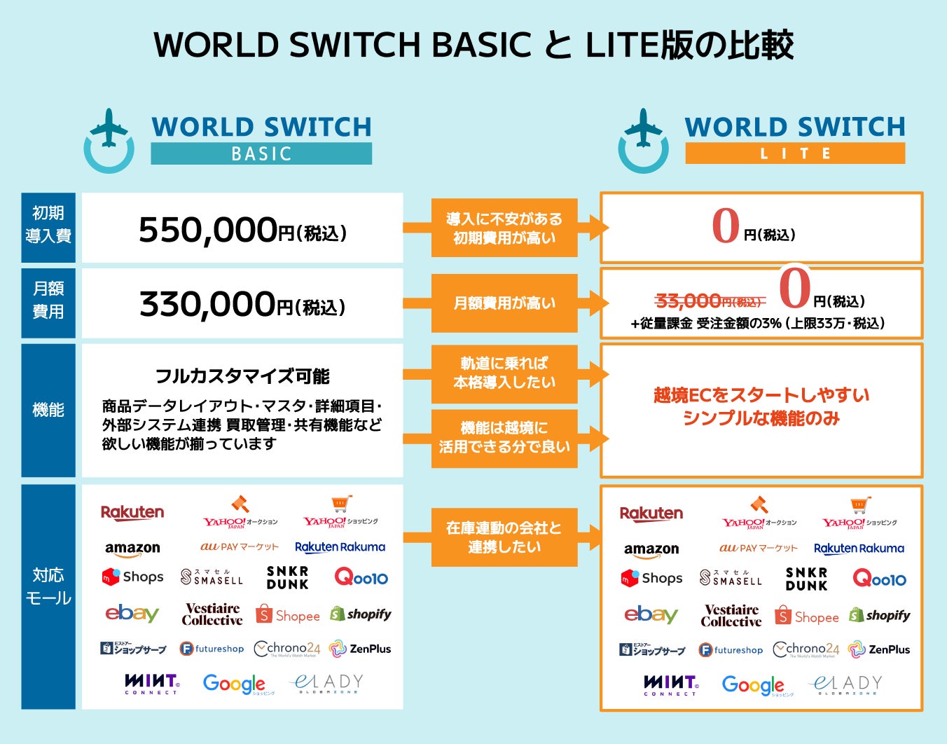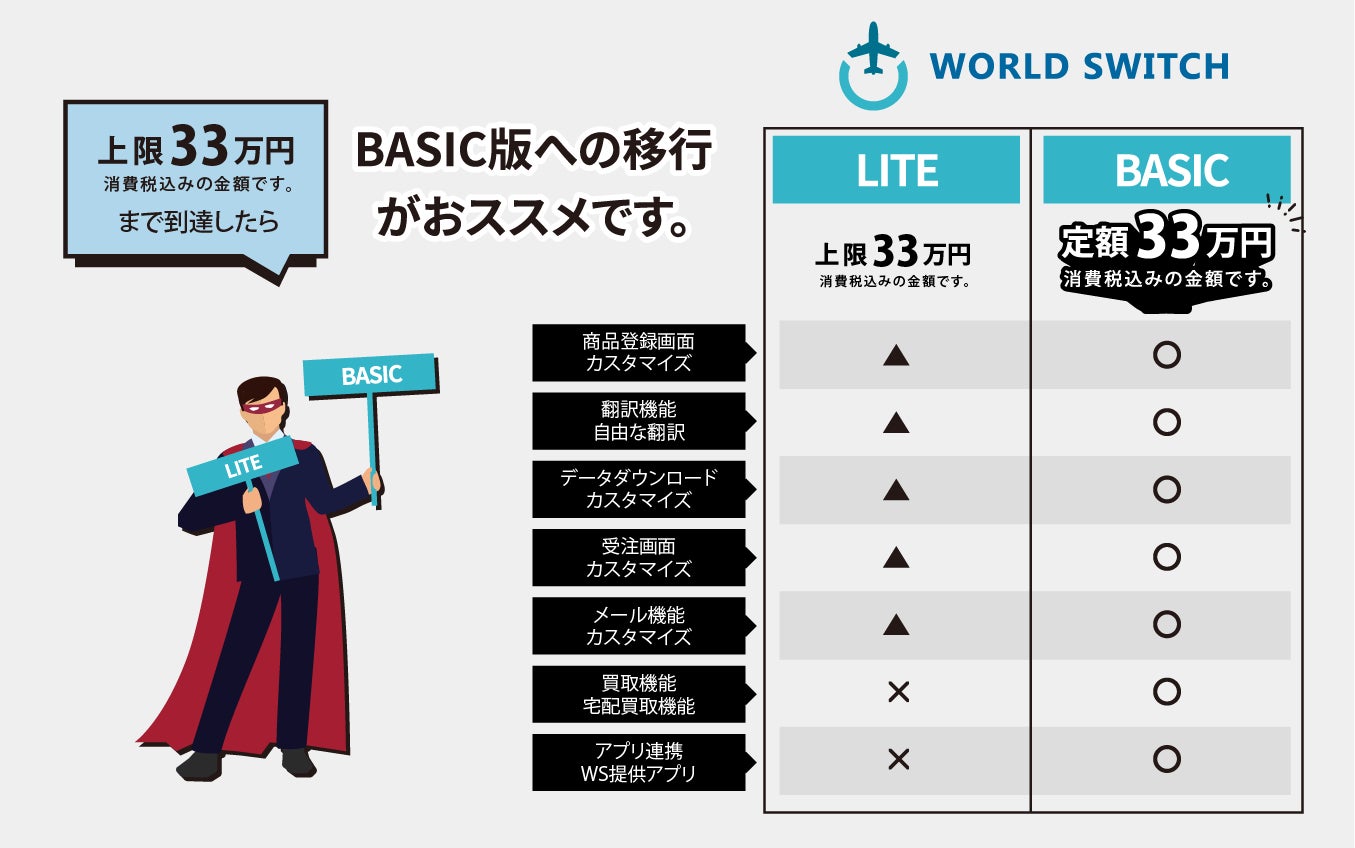 WORLD SWITCH BASICとLITE版の大きな違いは、費用面とカスタマイズ機能です。LITE版はこれから越境ECを考えている方や将来的に導入を考えている方、また越境販売のために最低限の機能を試してみたい方へ、費用を抑えて導入し易いプランをご用意いたしました。