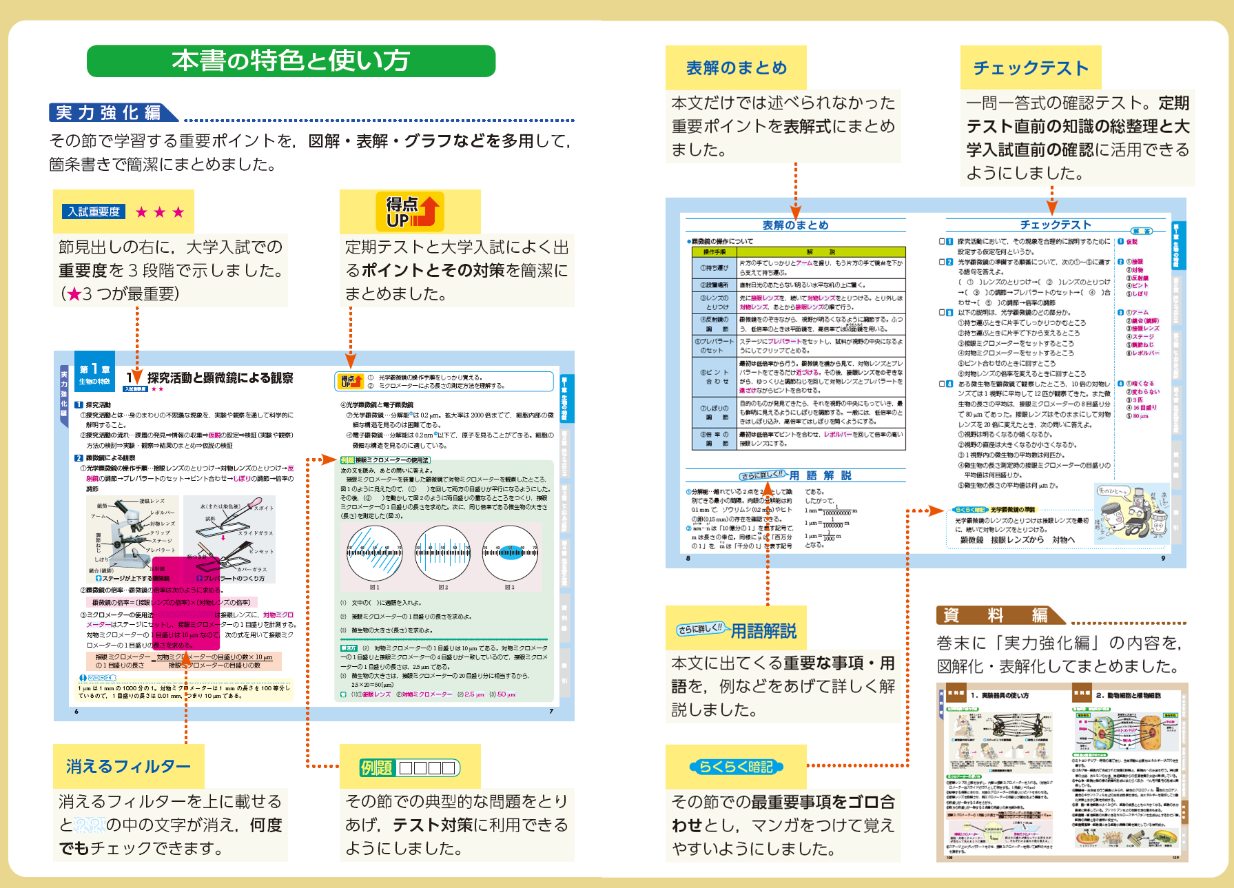 一問一答式の「チェックテスト」や入試問題を取り上げた「思考力強化ゼミ」など、定期テストや大学入試に役立つコーナーを設けました。