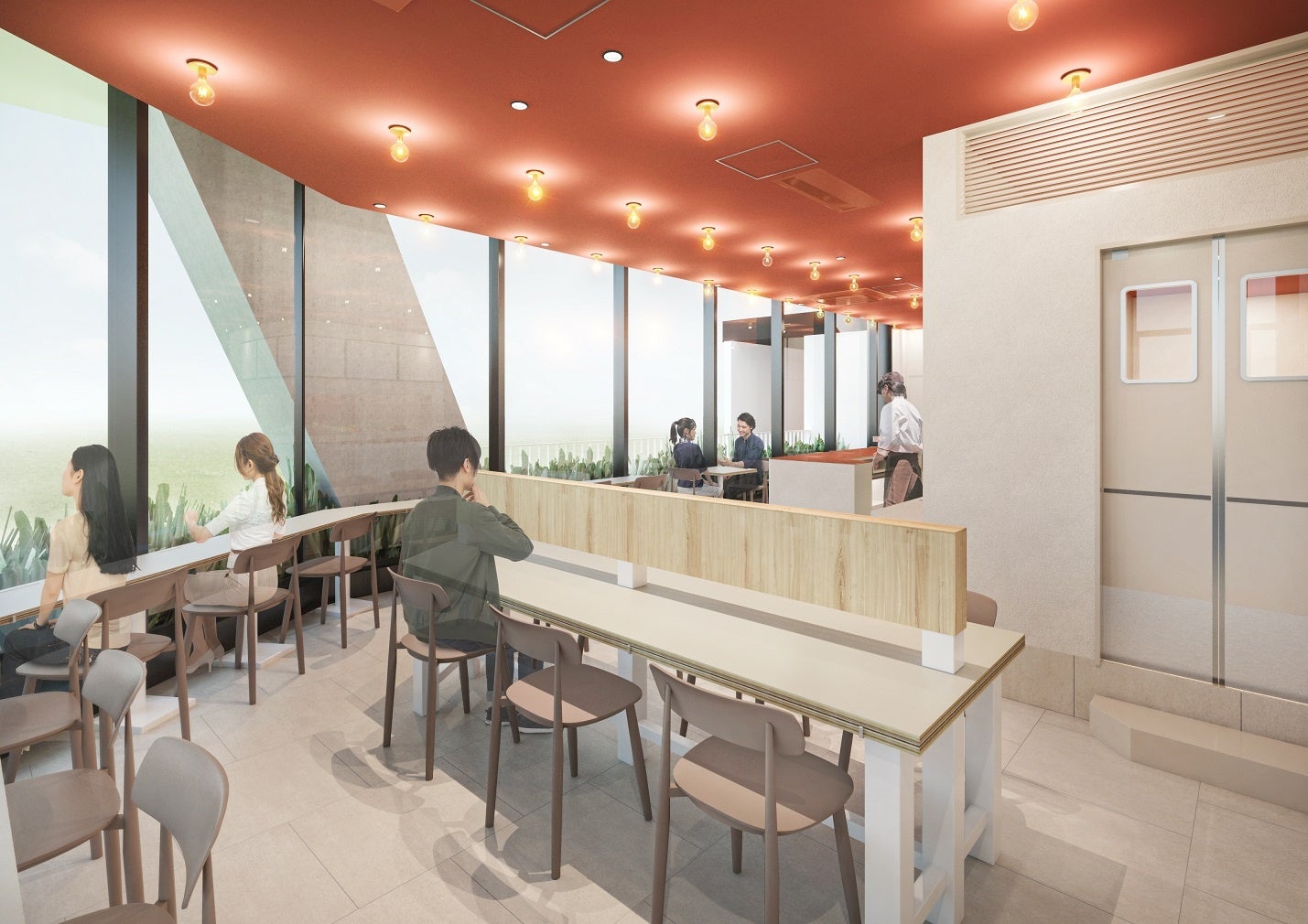 ガラス張りの大きな窓が広がり、開放感のあるイートインスペースは、店外の緑豊かなガーデンを見ながら、ゆっくりとお過ごしいただける空間です。また、カウンター全席にコンセントを設置。お仕事中やお買い物の休憩に、お一人様でも気軽にお立ち寄りいただけます。