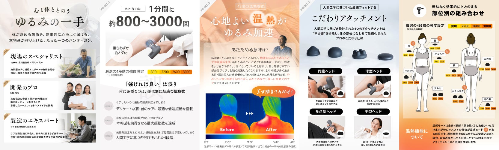 温熱×振動×刺激変化の組み合わせが生む【黄金ゆるみメソッド】を約235gのコンパクトなハンディガンに凝縮し、体の悩みを"溜める前"にケアできる「ホットハンディガン® Mini」を2026年3月3日(火)より発売。柔道整復師の知見と人間工学に基づいて厳選された4段階の振動レベル、45℃の温熱機能を搭載し、体の部位に応じた最適な刺激を届ける【手持ち整体】が誕生しました。