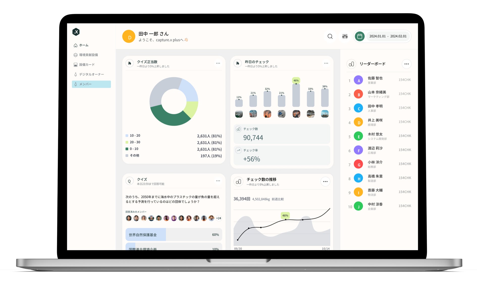 capture.xプラスは、これらの課題を解決し、社員全体を巻き込む脱炭素化への行動変容を実現します。ゲーミフィケーションとインセンティブを取り入れることで、脱炭素化に向けたコミュニケーションとアクションを活性化させ、継続的に社員全体が動くことを支援します。