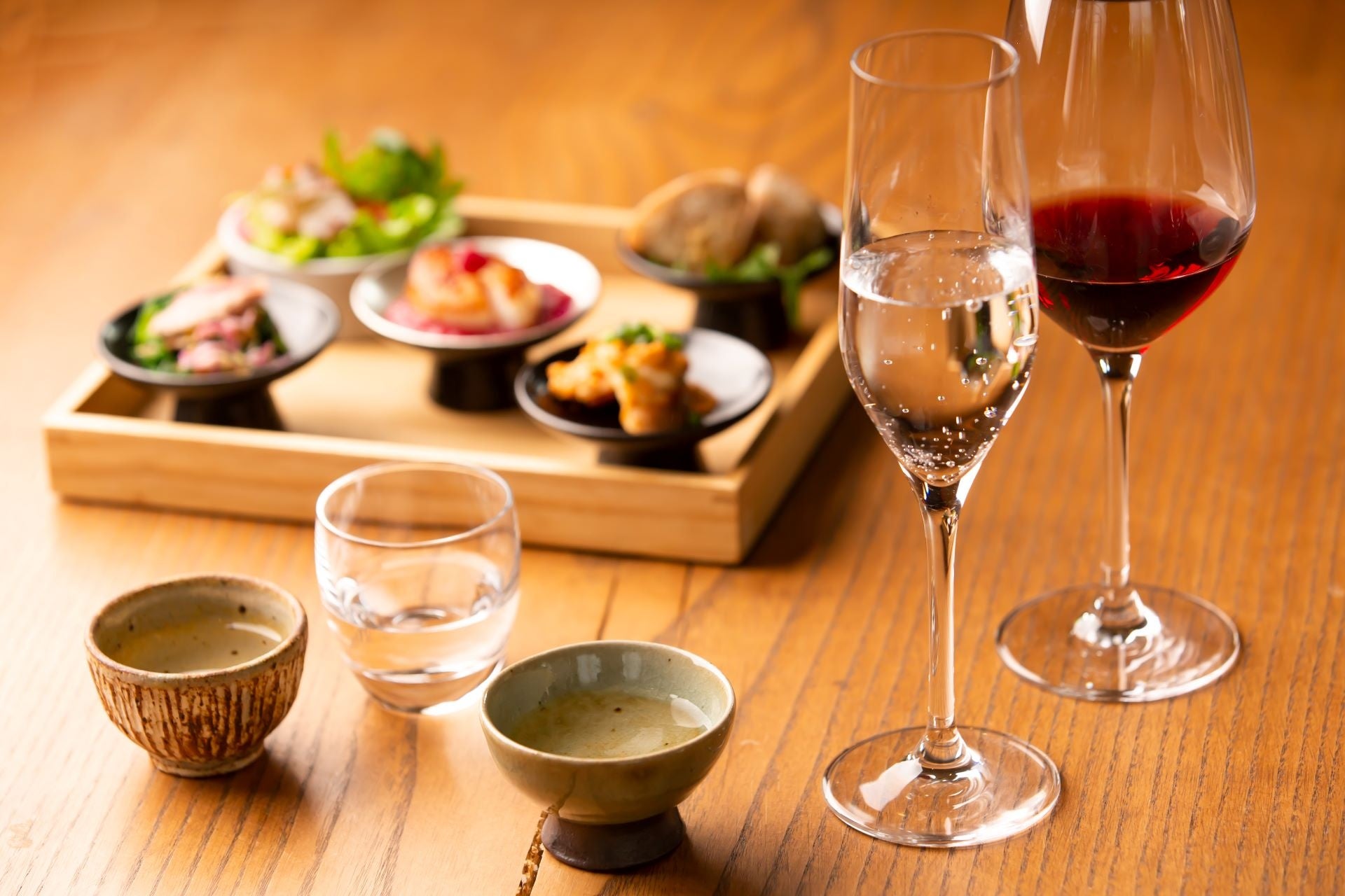 ■食の愉しみが広がる。日本酒やワインとともに金目鯛を味わう「ペアリング」をご用意。
