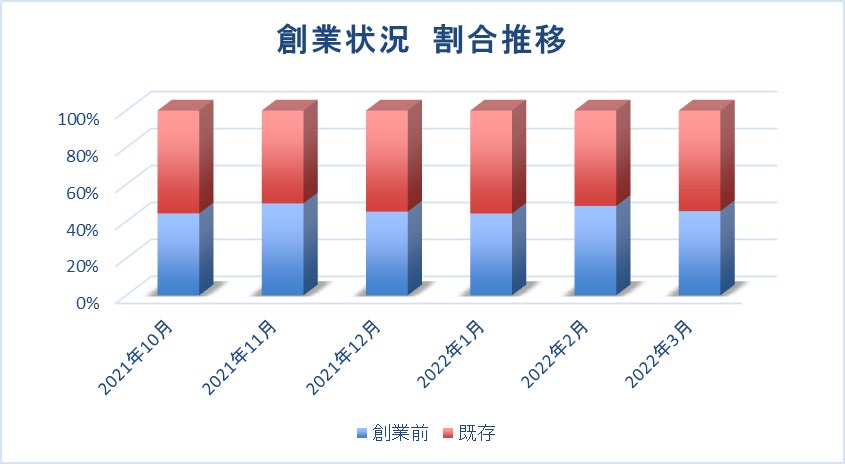 また、同期間の相談内容の内、創業状況が判明したものを大きく「創業前」「既存」とした際の割合推移について、「創業前」が44~50%、「既存」は50~56%となりました。コロナ禍においてこれまでは「創業前」と「既存」の事業者の割合は、社会状況の変化や国の施策を受け変動を見せることが多かったものの、今回は半年にわたり変動幅が小さく、相談件数が共に増加傾向を辿るという異様な状況となりました。昨年来の既存事業者の経営に対する不安や、補助金採択事業の実行に伴う資金調達相談等が増加傾向にありその対策が求められている状況が継続している一方で、コロナの状況を見ながら新規開業を目指す起業家も一定数維持されている様子がうかがえます。なお、2022年3月は今年度(2021年4月~2022年3月)で最多の月間相談件数となる見込みです。