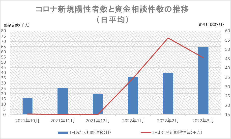 - コロナ感染者数が減少傾向にある反面、資金相談は3月に入り急増しており、月別の1日平均では、1月比146%増、2月比138%増という結果となりました。