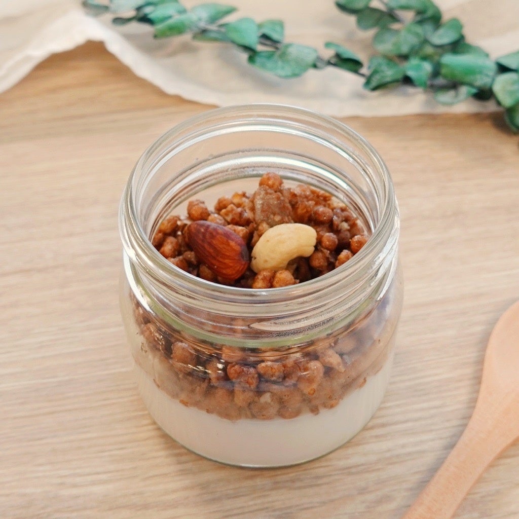 ぷるぷるのプリンとザクザクのグラノーラの食感差が楽しい、Wナッツのヘルシースイーツ