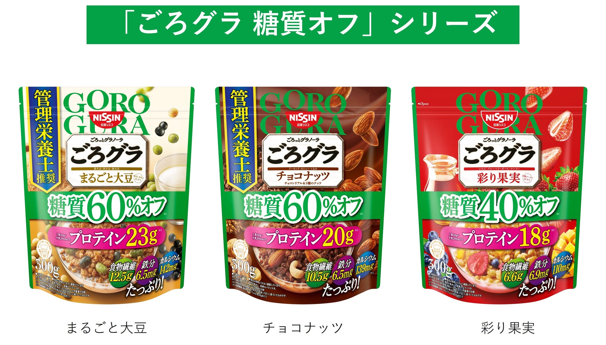 今回、本シリーズから「ごろグラ 糖質40%オフ 彩り果実 300g」を新発売します。2014年の「ごろグラ」シリーズ発売当初から続く人気フレーバー「彩り果実」のおいしさはそのままに、気になる糖質を40%オフ*。さらにプロテイン、食物繊維、鉄分、カルシウムをしっかりととることができます。「まるごと大豆」「チョコナッツ」に加え、新しくなった3種のバリエーションで、“我慢せずにおいしく健康志向な食事をしたい”という方の毎日の健康をサポートしていきます。