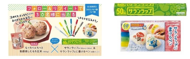 さらに、旭化成ホームプロダクツ様とコラボレーションした「発売記念!はくばく×旭化成ホームプロダクツ コラボキャンペーン」をTwitterにて9月1日(木)~9月7日(水)に実施いたします。本キャンペーンは、はくばくの公式ツイッター(@hakubaku_jp)をフォローし、当該キャンペーンの投稿をリツイートしていただくことで参加できます。参加者の中から抽選で30名様に『もっちりぷちっと食感楽しむもち玄米900g』+『サランラップ®』+『サランラップ®に書けるペン』のセットをプレゼントいたします。