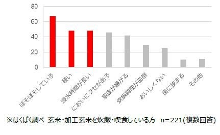 - 既存の玄米の不満点は「ぼそぼそしている」「硬い」「浸水時間が長い」