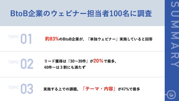 企業がウェビナー実施において抱える課題については、「テーマ・内容」が最も多く47%に上りました。各企業がウェビナー内でのコンテンツ作りに苦戦していることが指摘されています。