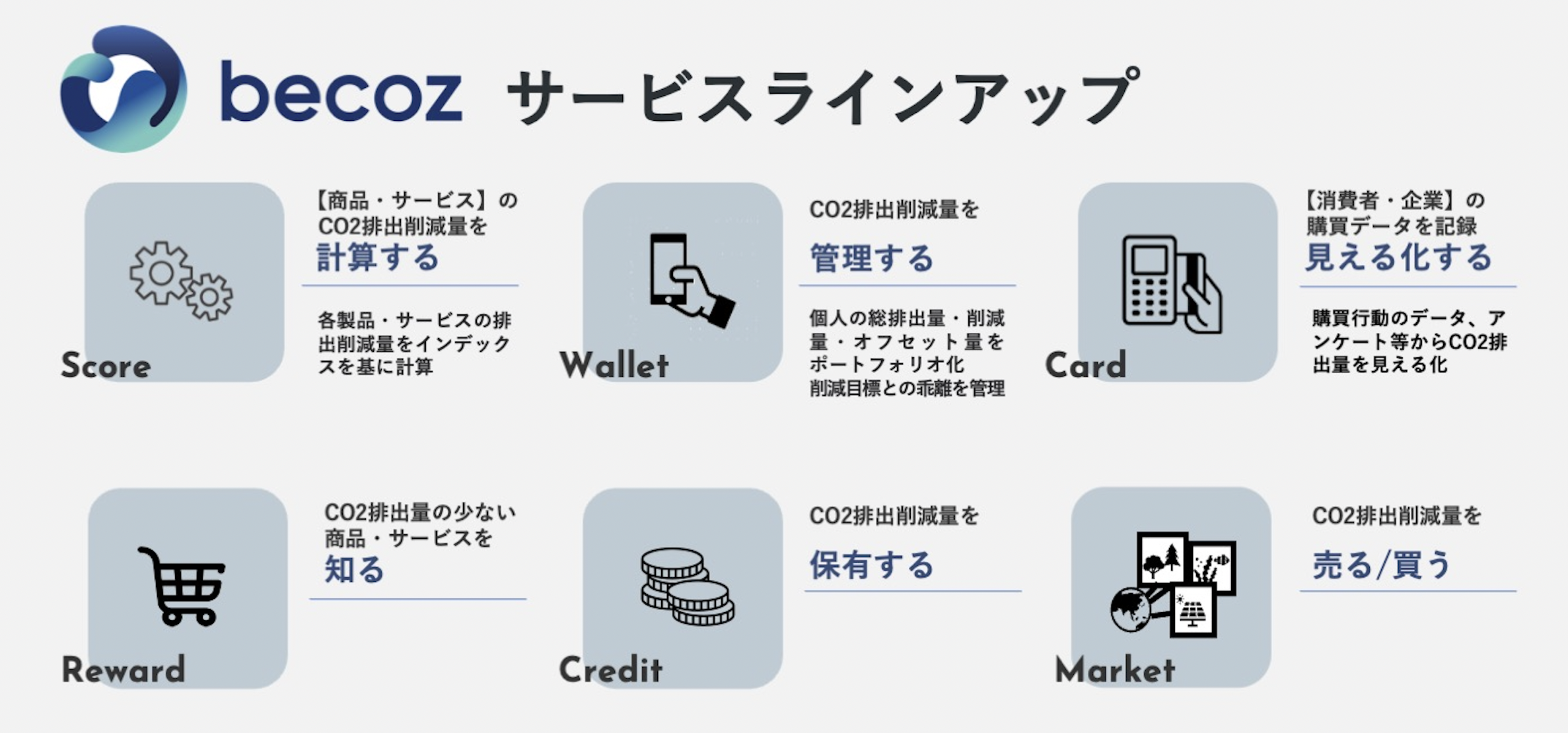 本事業は、決済データや移動データ、衛星データなどから総合的に商品やサービスのCO2排出削減量を計算し、サステナブルな購買を支援する『becoz score』や、個人のCO2総排出量、削減・オフセット量などを可視化する『becoz wallet』、気候変動の現状や脱炭素業界の動向を伝えるオウンドメディアなどのサービスを揃え、2022年5月上旬の提供開始を予定しております。