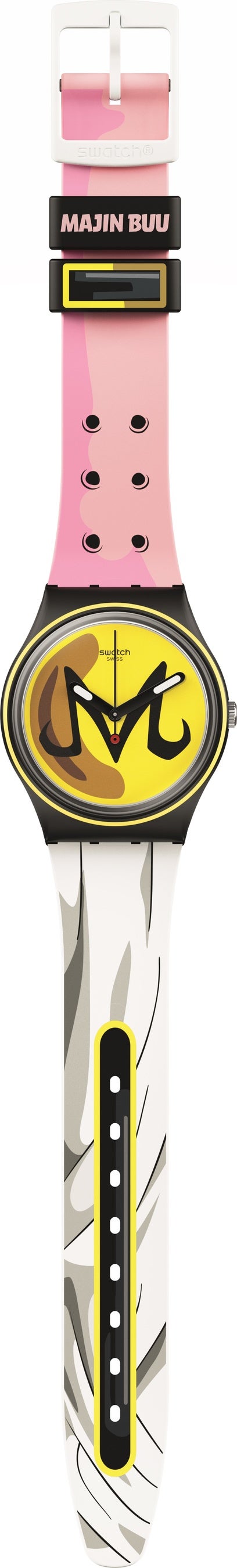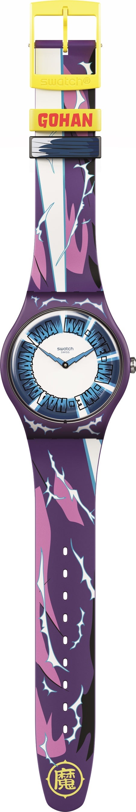 Swatch はカラフルで遊び心豊かに、独創的な表現をドラゴンボール Z に加えました。表面と裏面で各キャラクター 2 種類のバージョンや要素が表現されています。ループ上側にキャラクターの名前が、表は英語、裏は日本語で記されており、下側のループにはドラゴンボール Z のロゴがあしらわれています。