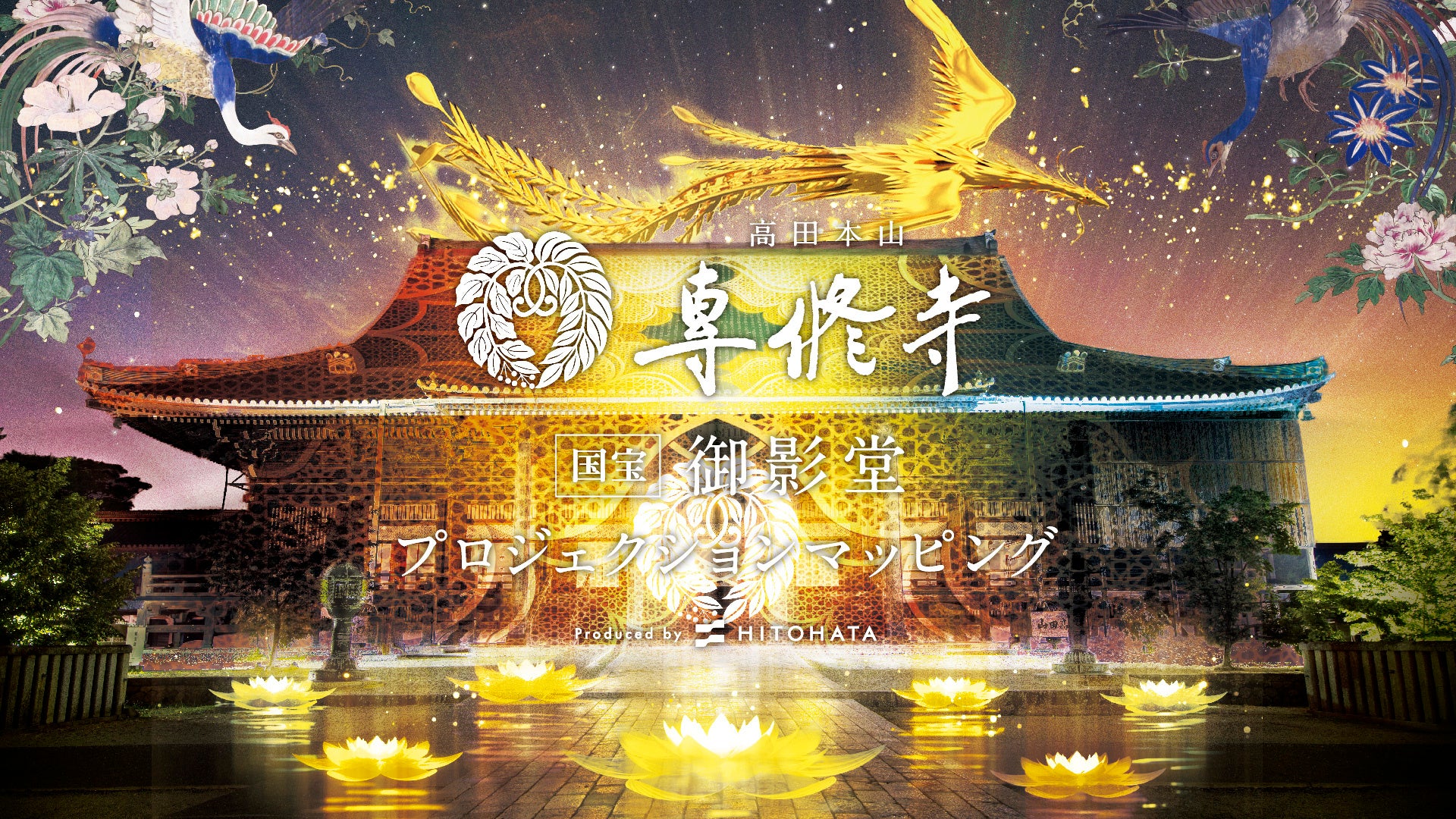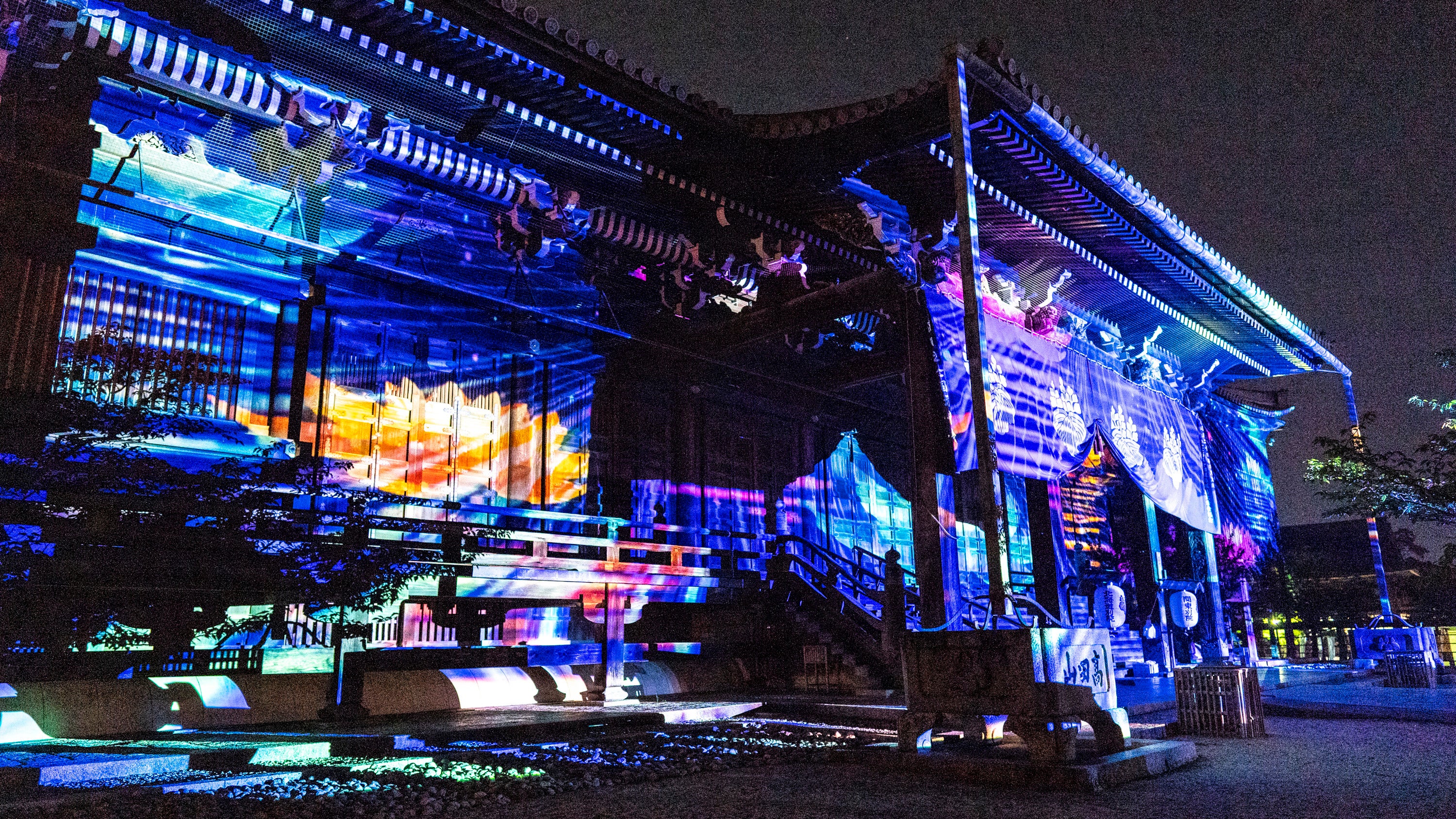 親鸞生誕850年1年前記念事業。幅約42メートル、高さ約25mの巨大な国宝木造建築物・御影堂に極彩色の鳥や蓮など専修寺が誇る文化財や象徴をモチーフとしたデジタルアートコンテンツを投影。