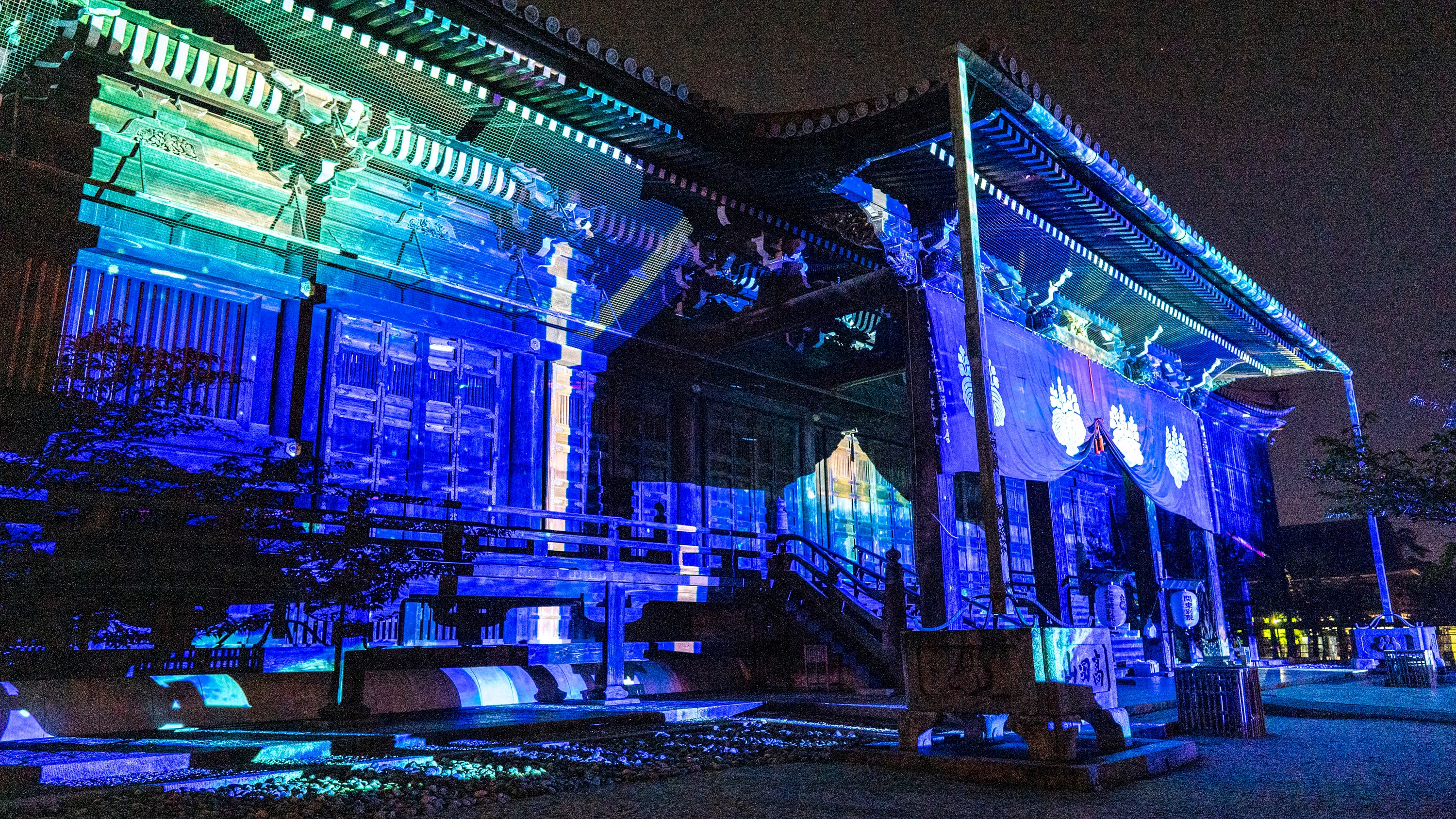 【内容】 2023年に迎える親鸞生誕850年の1年前記念事業として、幅約42メートル、高さ約25mの巨大な国宝木造建築物・御影堂に極彩色の鳥や蓮など専修寺が誇る文化財や象徴をモチーフとしたデジタルアートコンテンツなどのプロジェクションマッピング映像を投影しました。