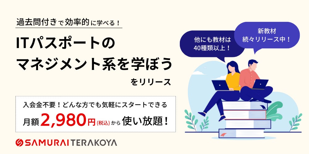 株式会社SAMURAI(本社所在地:東京都千代田区、代表取締役 :高比良 直人)は、運営するサブスクリプション型プログラミングスクール『侍テラコヤ』にて、新教材『ITパスポートのマネジメント系を学ぼう』をリリースしました。