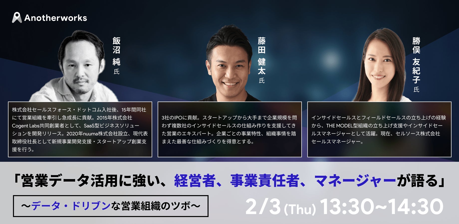 【2/3(木)無料ウェビナー開催】営業データ活用に強い、経営者・事業責任者・マネージャーが語る〜データ・ドリブンな営業組織のツボ〜