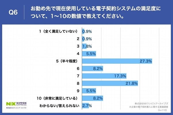 「Q6.お勤め先で現在使用している電子契約システムの満足度について、1~10の数値で教えてください。」(n=110)と質問したところ、「5(半々程度)」が27.3%、「8」が21.8%という回答となりました。