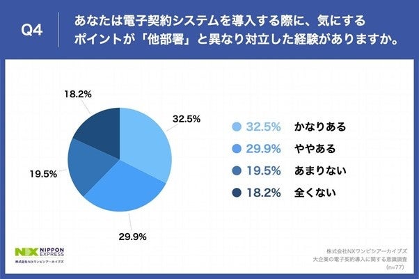 Q1で「セキュリティの水準」と回答した方に、「Q4.あなたは電子契約システムを導入する際に、気にするポイントが「他部署」と異なり対立した経験がありますか。」(n=77)と質問したところ、「かなりある」が32.5%、「ややある」が29.9%という回答となりました。